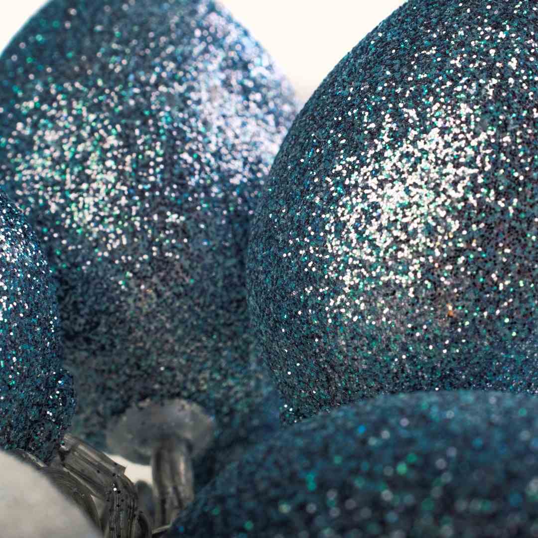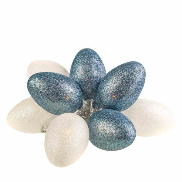 10 plastikowych jajek LED w kolorze biało-szarym o rozmiarze 6*4cm, osypanych brokatem (kolor jak na zdjęciu lub białe z szarym) z transparentnym kablem. Odległość pomiędzy jajkami to 15cm,