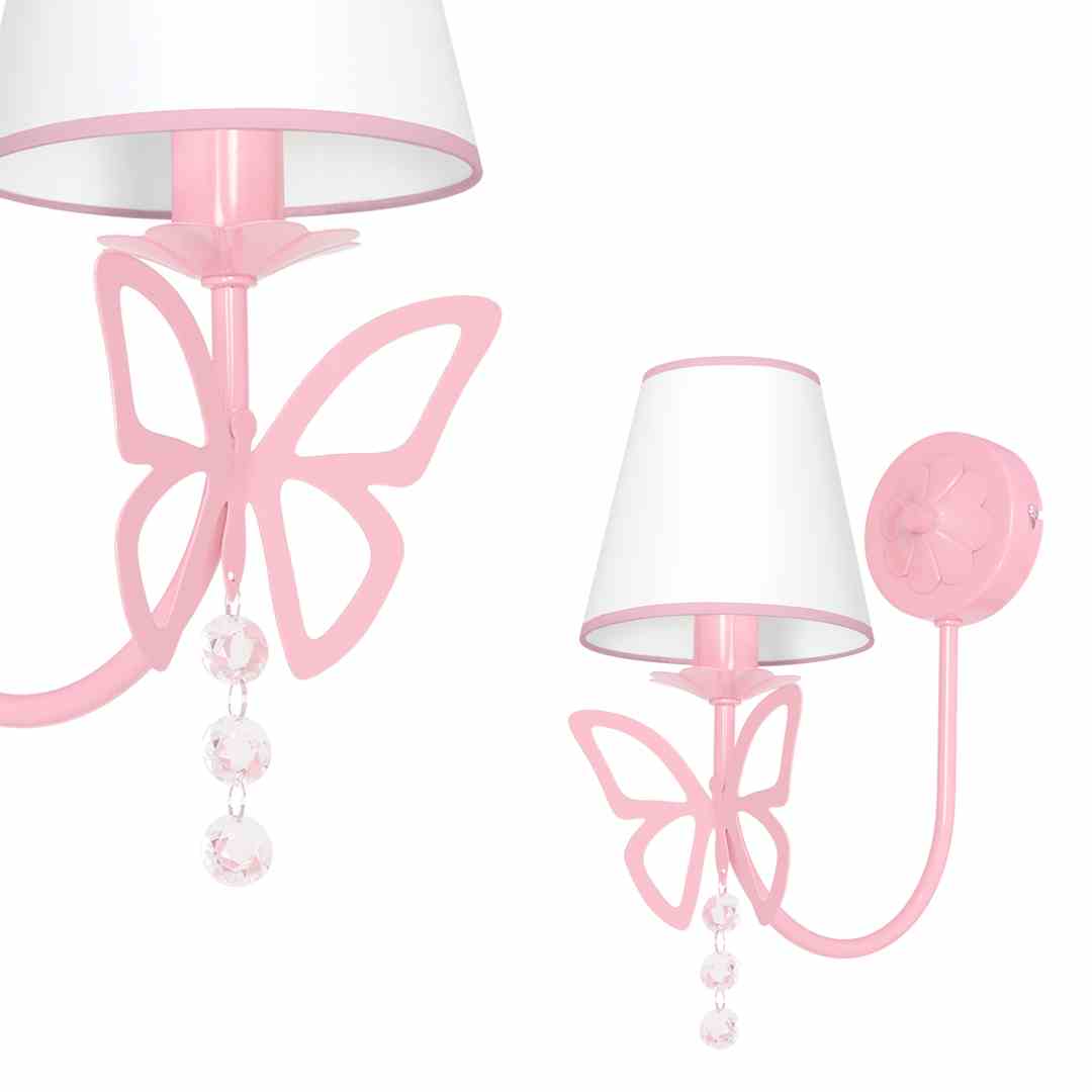 Wyróżniającym elementem kolekcji CHARLOTTE PINK są eleganckie lampy z abażurami ozdobionymi szlachetnymi kryształkami oraz motyw latających motyli. Lampy doskonale sprawdzą się zarówno w pokojach dziecięcych, jak i salonach oraz sypialniach. Klienci mogą wybierać spośród szerokiej rodziny lamp CHARLOTTE w skład której wchodzą: zwisy sufitowe z trzema lub czterema punktami światła oraz kinkiet i lampka biurkowa z jednym źródłem światła. Łącząc w pomieszczeniu kilka lamp z serii, można stworzyć spójną i kompletną aranżację. Cała kolekcja dostępna jest w dwóch wersjach kolorystycznych w białej i w różowej.
