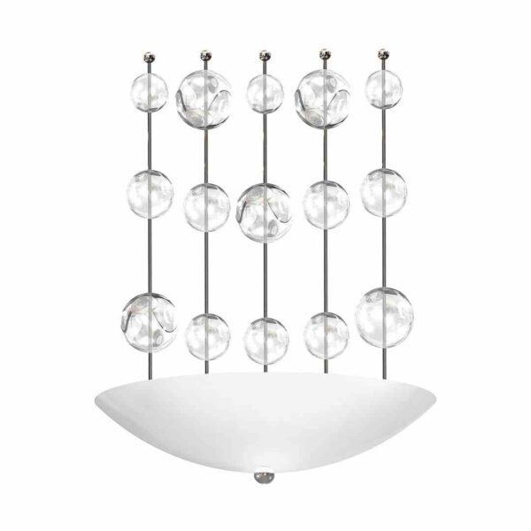 Lampa ścienna PERLA BIANCO 856 doda blasku wnętrzom utrzymanym w nowoczesnej stylistyce. Szklane kule “naplecione” na metalowe pręty pięknie odbijają światło, a biała oprawa w kształcie półkola będzie pasować do ściany we właściwie każdym kolorze.