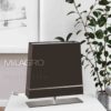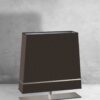 Modna lampa stojąca z efektownym abażurem na prostokątnej podstawie.