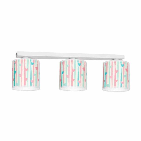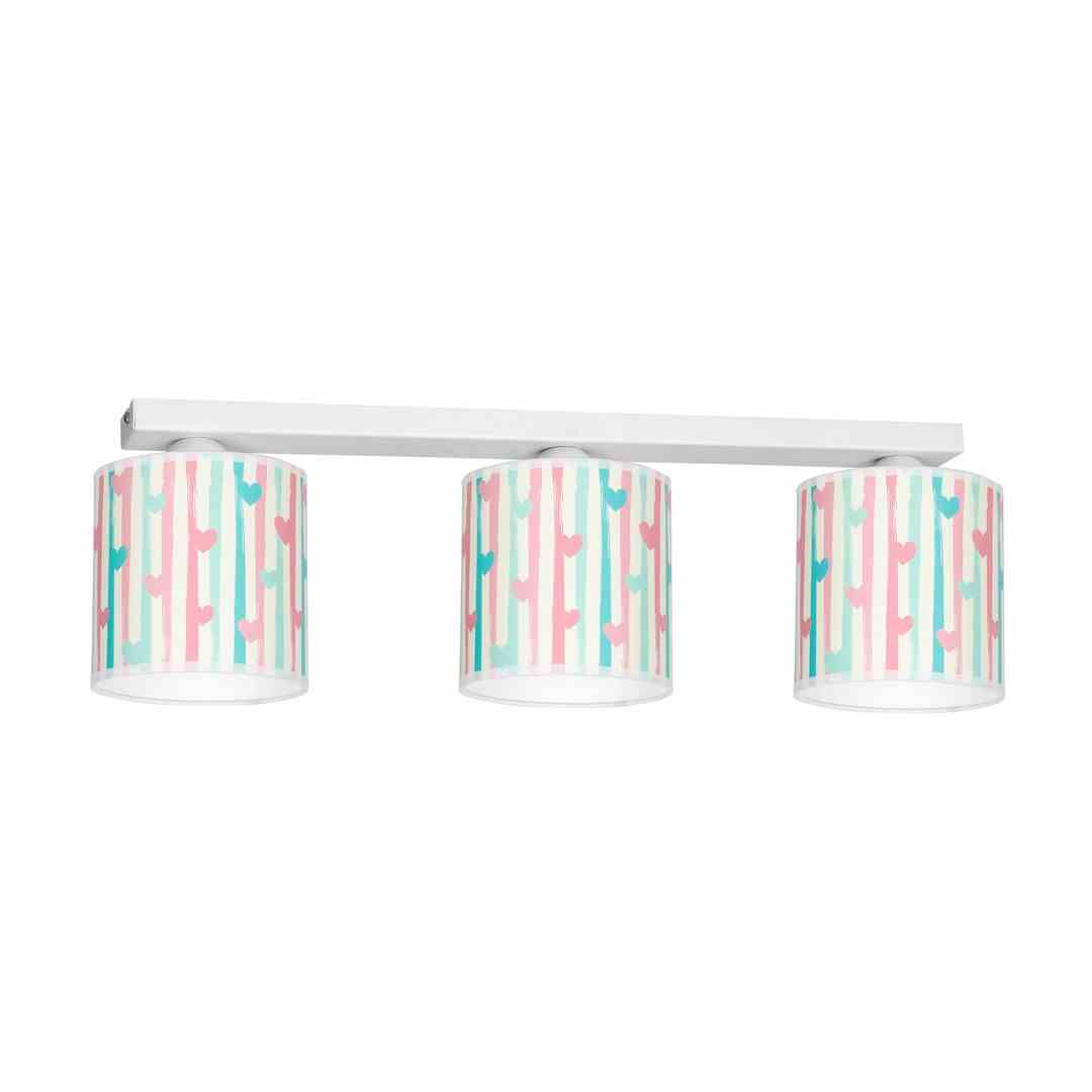 Dziecięca kolekcja LOVELY to seria lamp w różnych konfiguracjach. Wśród nich znaleźć możemy lampy sufitowe z jednym i trzema punktami światła na listwie, z trzema osobnymi kloszami oraz zwisające z listwy. Ponadto, wiszące lampy mają możliwość regulacji wysokości zwisu, dzięki czemu można dopasować je do wnętrz o różnych wysokościach. Elementem wyróżniającym produkty tej serii są wielokolorowe abażury z motywem serca, które z pewnością sprawdzą się w dziewczęcym pokoju.