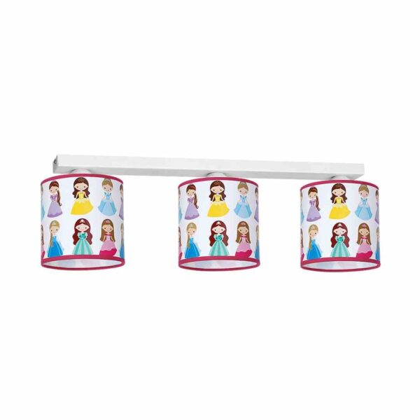 Lampa sufitowa Princess 3xE27 jest wyprodukowany w Polcse przez firmę Milagro. Jest to uzupełnieni całej serii lamp przeznaczonej do pokoju dziecięcego z motywem księżniczek. Jasny abażur efektywnie oddaje światło i nastrój pokoju dla dzieci. Lampa sufitowa o 3 punktach świetlnych pozwala na oświetlenia zarówni nickich pomieszczeń jak i wysokich.