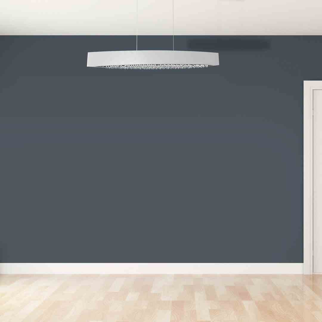 Za pomocą modelu BOCCA 015 można wyeksponować jako lampę sufitową. Opływowa oprawa w kształcie łezki ułożonej poziomo został umieszczona na dwóch regulowanych zawiesiach o długości od 60 cm do 100 cm. Z drugiej strony zawiesia zamontowano przy podłużnej podsufitce o długości 31 cm, szerokości 6 cm i wysokości 4 cm. W dolnej części oprawy lampę dekorują urocze kryształki, które dodają całości stylu. Żyrandol ma jeden moduł LED o mocy równej 18 W, co odpowiada mocy 93 W w przypadku tradycyjnej żarówki. Strumień świetlny wymiennego światła LED ma wartość 1260 lm. Punkt świetlny zapewnia przyjemne dla oka światło zbliżone do światła dziennego. Temperatura barwowa sięga tu 4000 K.