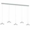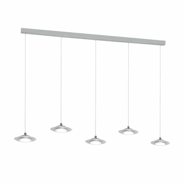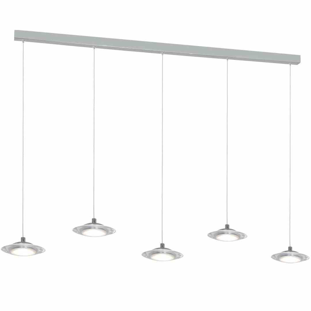 „Nowoczesna wisząca lampa LED jest połączeniem współczesnego wzornictwa, starannego wykonania oraz najlepszych materiałów. Posiada 5 punktów światła, które można dowolnie regulować od 20 do 100 cm wysokości. Łączna moc modułów LED to 25 W, które odpowiadają 126 W tradycyjnej żarówki. Do tego jasny strumień świetlny – 1750 lm o neutralnej białej barwie 4000 K. Szerokość elementu świetlnego to 80 cm, z kolei średnica każdego klosza wynosi zaledwie 11 cm. Lampę wykończono w eleganckim i stylowym chromie.