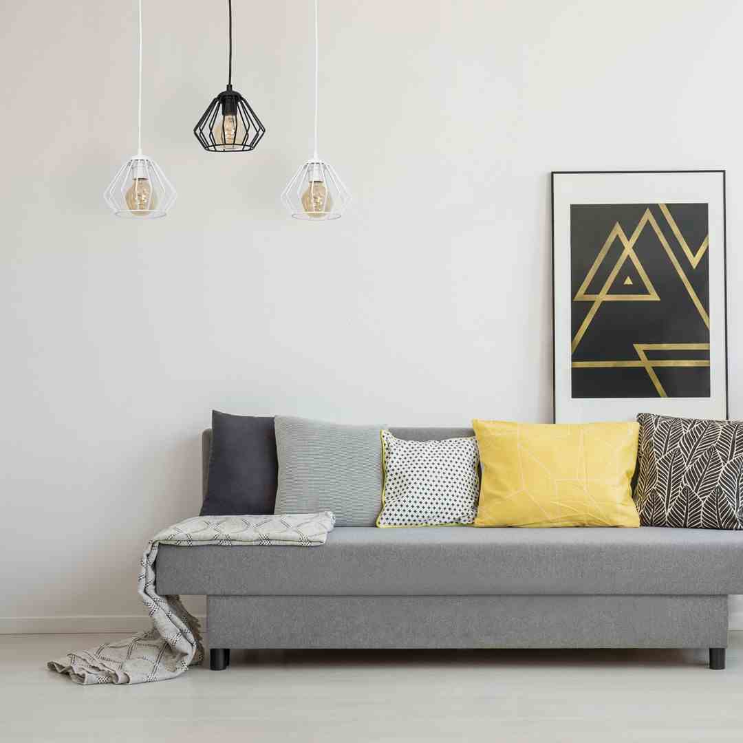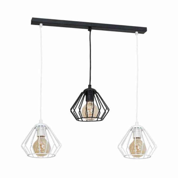 Lampa FERRO 133 to efektowny model, przeznaczony do montażu pod sufitem. Dzięki trzem punktom świetlnym umieszczonym w trzech drucianych oprawach lampa daje wystarczająco dużo światła. Klosze przymocowano do podłużnej podsufitki za pomocą regulowanych przewodów, których maksymalna długość może wynosić 1 m. Dwie zewnętrzne oprawy i kable wykonano w kolorze białym, natomiast środkowy w kontrastującej czerni. W oprawach znajduje się miejsce na żarówkę o gwincie oznaczonym symbolem E27. Moc każdego źródła światła powinna wynosić nie więcej niż 60 W. Szerokość lampy FERRO 133 to 60 cm.