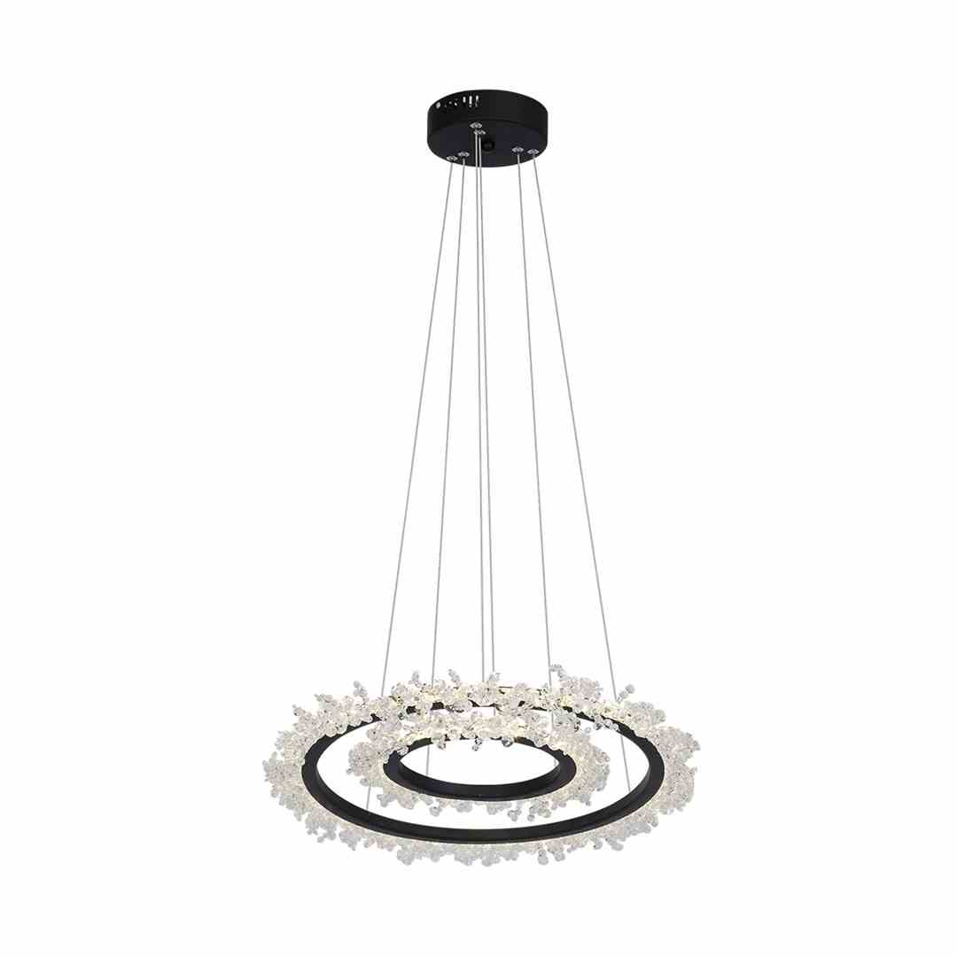 Wiszące lampy sufitowe z kolekcji Frozen oferowane są w dwóch modelach: z jednym lub dwoma okrągłymi punktami światła. Pierwsza ma średnicę 40 cm i waży 2,6 kg, z kolei większa ma 50 cm średnicy i wagę 5 kg. Wbudowane źródło światła charakteryzuje się jasnością 1800 lub 3600 lm i ma przyjemną dla oka naturalną barwę 4000 K. W obu modelach jest też możliwość regulacji wysokości zwisu od 50 do 90 cm. Lampy zostały wykonane z metalu oraz kryształów. Mają moc 30 lub 60 W.