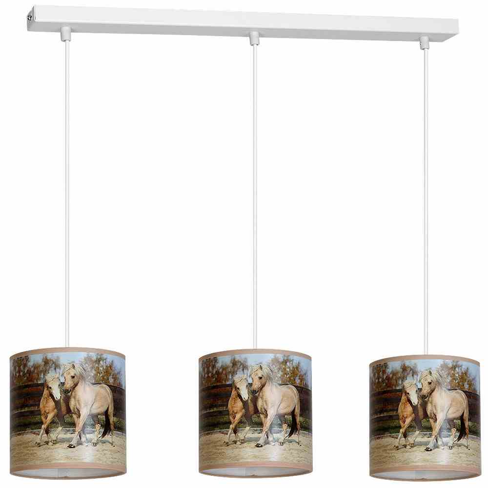Lampy Horses to nowoczesne oświetlenie. W skład serii wchodzą: plafon i zwis sufitowy z trzema źródłami światła oraz kinkiet i lampka biurkowa z jednym źródłem światła. Elementem wyróżniającym oświetlenie Horses są wielokolorowe abażury z grafiką, na której zamieszczono galopujące konie. Lampa świeci przyjemnym, nie męczącym oczu ciepłym białym światłem. Do oświetlania zaleca się stosowanie żarówek LED z gwintem E27. Dodając do pomieszczenia pozostałe lampy z kolekcji można stworzyć spójną i kompletną aranżację. Producent udziela na lampy 24-miesięcznej gwarancji, w ramach której świadczy nieodpłatnie usługi gwarancyjne.