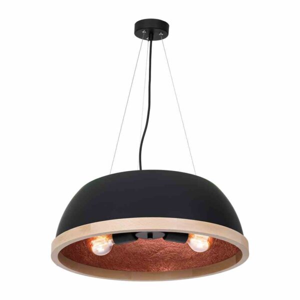 Stylowe lampy o półokrągłym kloszu, którego głębokość i szerokość wynoszą po 50 cm występują w kolorze białym oraz czarnym, dzięki czemu będą pasowały do wielu pomieszczeń. Końce klosza wykończono drewnianą obręczą. Modele te możesz zamontować zarówno w sypialni czy salonie, jak i w jadalni i kuchni. Wysokość, na jakiej umieścisz lampy zależy tylko od Ciebie. Regulowany zwis pozwala na umieszczenie jej od 50 cm do 90 cm pod sufitem.