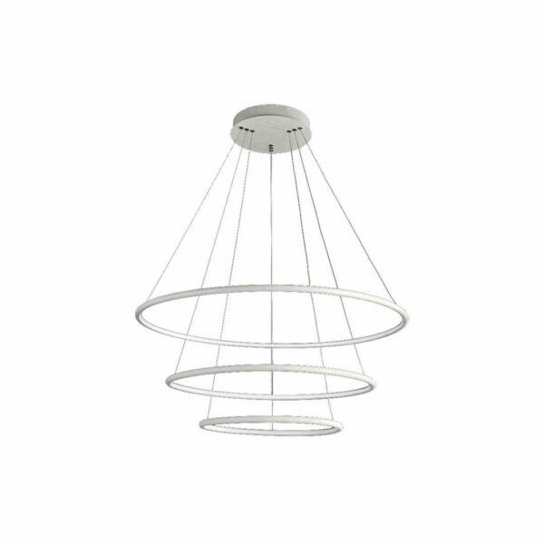 Lampa składa się z trzech źródeł światła, których wysokość można dowolnie regulować do 10 cm. Takie rozwiązanie pozwala na dopasowanie jej do pomieszczeń zarówno wysokich, jak i niskich. Trzy okrągłe oprawy mają różne średnice: 40 cm, 60 cm i 80 cm. Zamontowano w nich wymienne moduły LED o łącznej mocy 99W, które odpowiadają 500W tradycyjnej żarówce. Barwę oświetlenia dobrano w taki sposób, aby lampa gwarantowała jak największy komfort jej użytkowania, stąd barwa najbardziej neutralna 4000K oraz bardzo wysoka jasność 6930 lm. Produkt wykonano z metalu i akrylu.