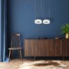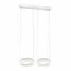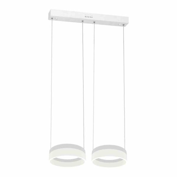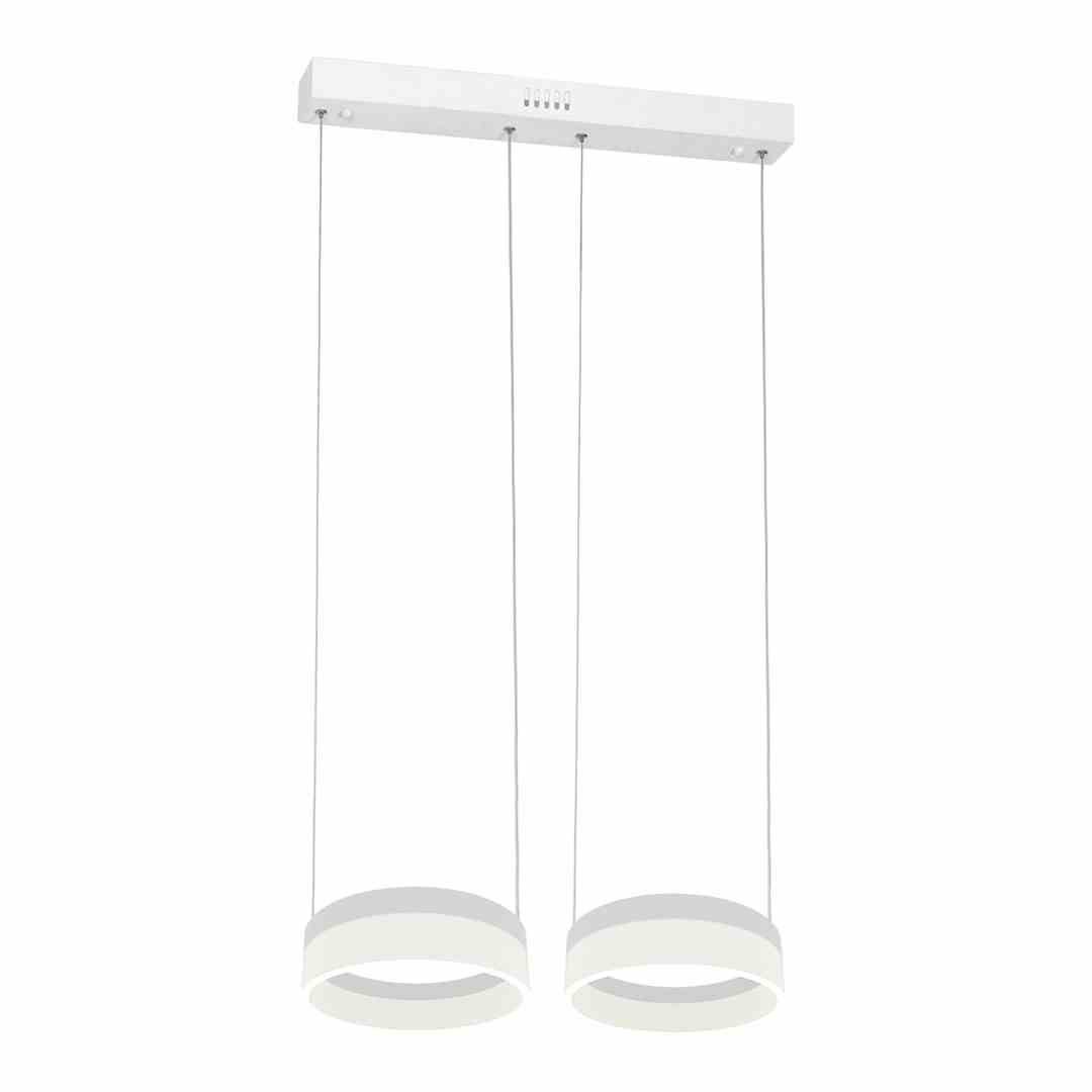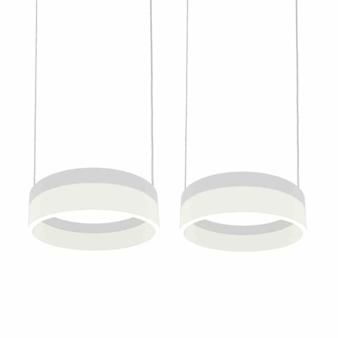 „Nowoczesna lampa o prostej formie, na którą składają się dwa źródła światła przypominające swoim kształtem pierścienie. Każdy z zainstalowanych modułów LED jest wymienny, a ich łączna moc to 24 W. Ponadto wysokość opraw można dowolnie regulować od 60 do 120 cm. To praktyczne rozwiązanie pozwala na bezproblemowe dopasowanie lampy do wysokości pomieszczenia. Przyjemna dla oka barwa 4000 K ma jasność 1680 lm. Lampa została wykonana z metalu i akrylu. W zestawie znajdują się niezbędne elementy do jej montażu.