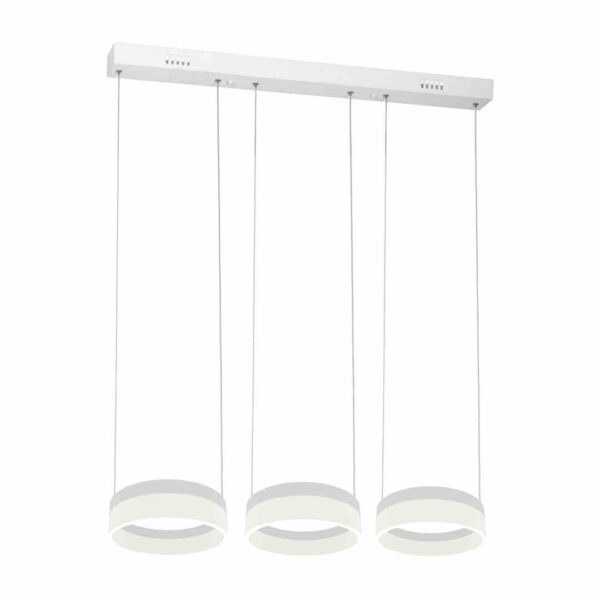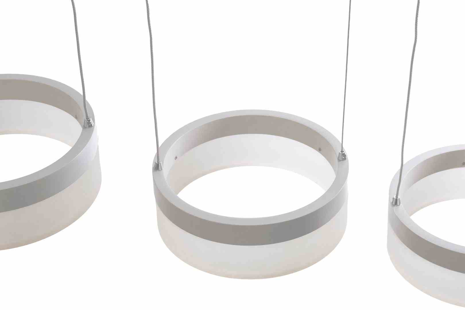 „Wisząca lampa sufitowa 407 z kolekcji Ring wyróżnia się 3 źródłami światła w kształcie pierścieni. Każdy z nich ma 20 cm średnicy oraz moc 12 W – w sumie 36 W. Szerokość lampy to z kolei 70 cm, wykończone w białym kolorze. Strumień świetlny ma przyjemną dla oka, neutralną barwę 4000 K oraz jasność 2520 lm. Wysokość opraw można dowolnie regulować od 60 do 120 cm.