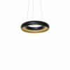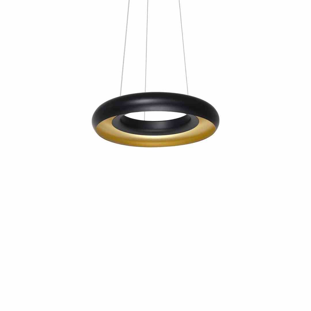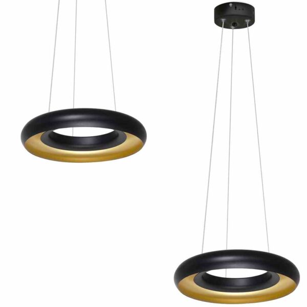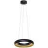 Nowoczesna lampa sufitowa firmy MiLAGRO wykonana z metalu w kolorze czarno-złotym. Okrągła oprawa wygląda niezwykle efektownie, zamontowano w niej wymienny moduł LED o mocy 12 W, które odpowiadają 65 W tradycyjnej żarówki. Niewielka średnica klosza – 23 cm, sprawdzi się w pomieszczeniach o niedużym metrażu lub jako oświetlenie konkretnych przestrzeni, np. wypoczynkowych. Wysokość lampy można dowolnie regulować od 60 do 100 cm. Barwa oświetlenia ma 4000 K, jasność jest na poziomie 840 lm.