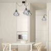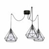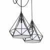 Lampa wisząca TRIANGOLO 163 składa się z trzech drucianych kloszy z geometrycznymi wycięciami, które są połączone z rozetą luźno wiszącymi przewodami. Dzięki specjalnym haczykom można je uformować w taki sposób, że przypominają pajęczą sieć. Ten model można instalować samodzielnie, ale jeszcze efektowniej wygląda w połączeniu z innymi modelami z kolekcji TRIANGOLO.
