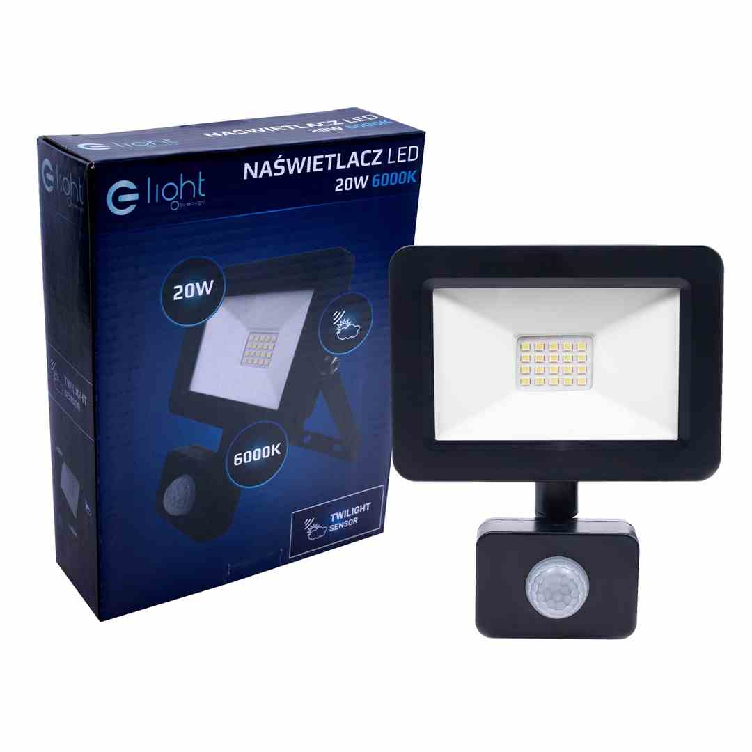 Naświetlacz Led 20W PIR w kolorze czarnym o barwie światła 6000K w kolorze czarnym firmy Eko-Light jest wyprodukowany z wysokiej jakości materiałów oraz w zaawansowanej technologii led z czujnikiem ruchu oraz zmierzchu. Konstrukcja pozwala na zastosowanie w pomieszczenieach o podwyzszonej wilgotności oraz na zewnątrz do podświetlenia budynków, podjazdów, drzew, architektury ogrodu itp. Naświetlacz jest wytrzymały na warunki atmosferyczne i będzie służył długie lata. Wyróżnia go duża energooszczędność, estetyka , konstrukcja z zachowaniem klasy szczelności IP65.