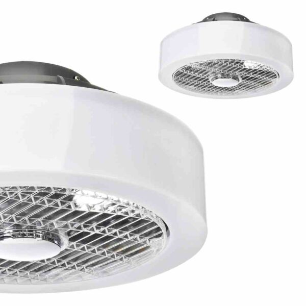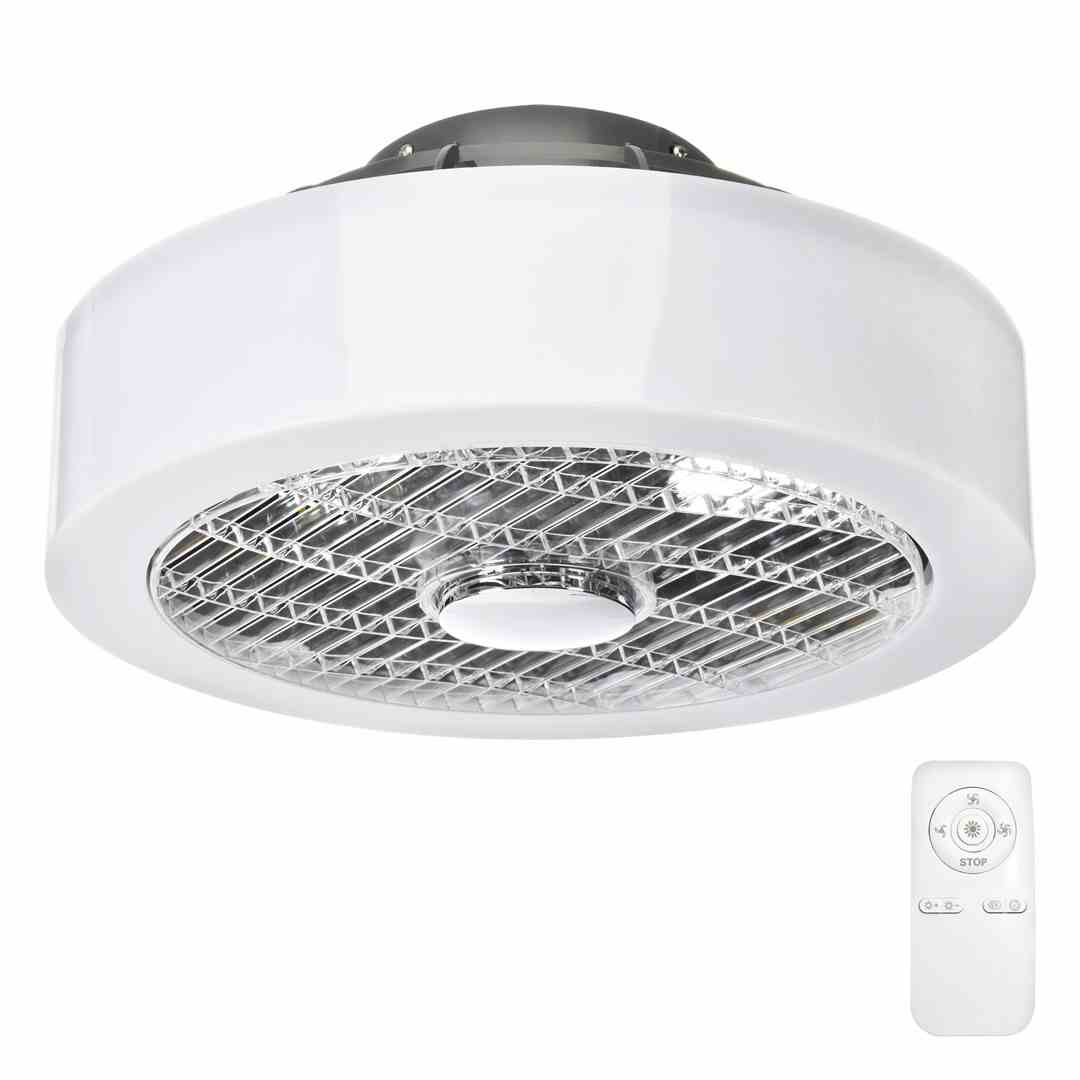 Plafoniera MISTRAL ML6091to nowoczesna lampa o kompaktowych wymiarach: jej średnica wynosi 40 cm, a wysokość ma 19 cm. Model ten został wyposażony w praktyczny wentylator o mocy 25 W, który będzie przydatny szczególnie podczas ciepłych, letnich dni. Wentylator wystarcza na schłodzenie pomieszczenie o wielkości 20 metrów kwadratowych, generując przy tym niewielki hałas na poziomie 35dB. Lampą można sterować za pomocą pilota. Dzięki niemu możliwa jest zmiana barwy światła lampy, jej ściemnianie, a także regulacja mocy wentylatora. Przy tym modelu jest także możliwość rotacji wstecznej wentylatora.