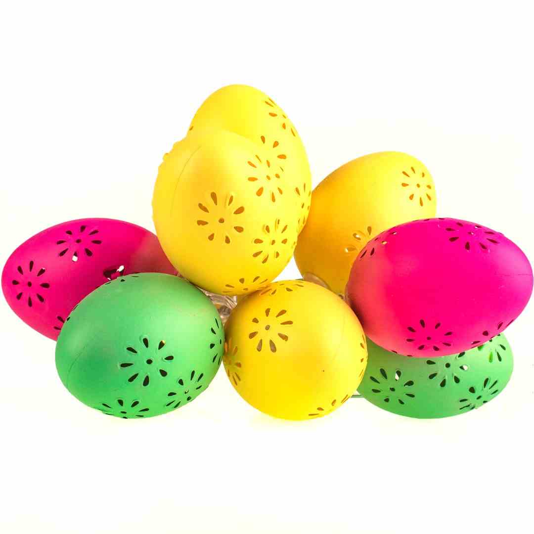 10 plastikowych jajek LED w rozmiarze 6*4cm, ze wzorem, kolor jak na zdjęciu, z transparentnym kablem. Odległość pomiędzy jajkami to 15cm, długość kabla pomiędzy jajkiem, a opakowaniem na baterie (2AA – brak w zestawie) to 26cm. Pakowane w PCV.