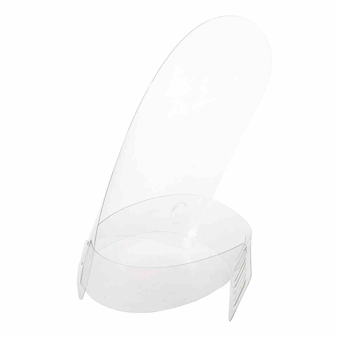 Przyłbica ochronna na twarz wykonana z tworzywa PET z o grubości 0,3mm. Pełna transparentność zapewnia doskonałą widoczność i nie ogranicza pola widzenia. Mocowanie w postaci regulowanego paska zapinanego na rzep pozwala na idealne dopasowanie do kształtu głowy. Przyłbica chroni całą twarz, brodę i czoło przed kontaktem z zarazkami oraz ogranicza możliwość dotykania twarzy dłońmi. Przeznaczona jest dla osób pracujących w sektorach przemysłowych, medycznych i budowlanych. Przemyślana konstrukcja przyłbicy umożliwia noszenie dodatkowych elementów ochronnych jak maseczki czy okulary.