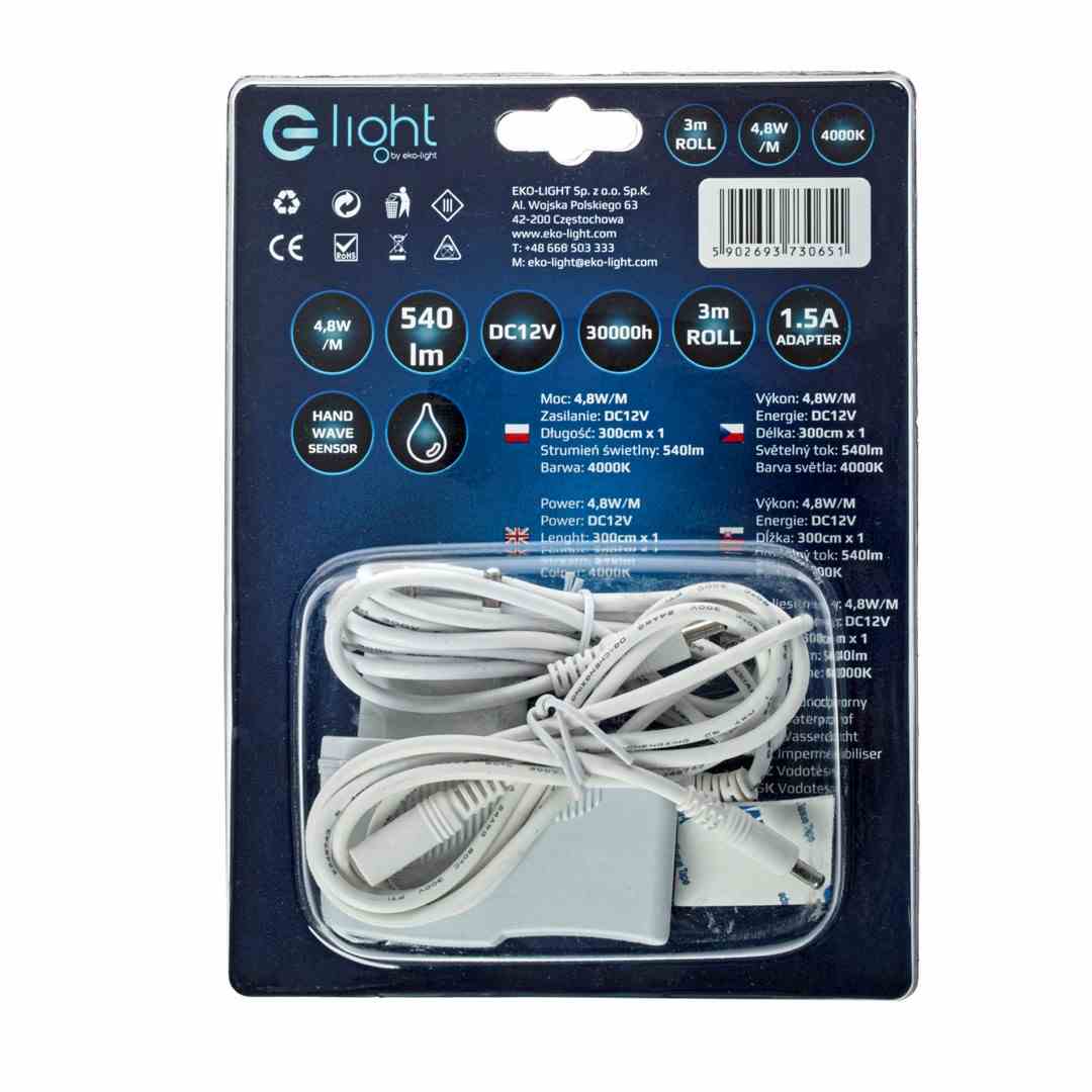 Taśma Led marki EKO-LIGHT EKZ0651 1x3M WYPOSAŻONA W CZUJNIK BEZDOTYKOWY ORAZ ZASILACZ 12V BARWA NEUTRALNA 4000K. Produkt znajduje szerokie zastosowanie przy podświetleniu elementów wyposażenia wnętrz np.. Łóżka, szafki nocne, półki et.