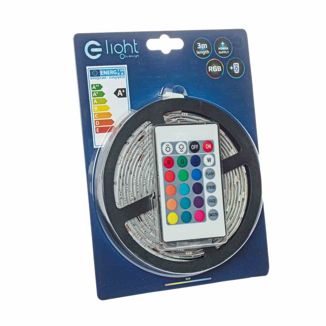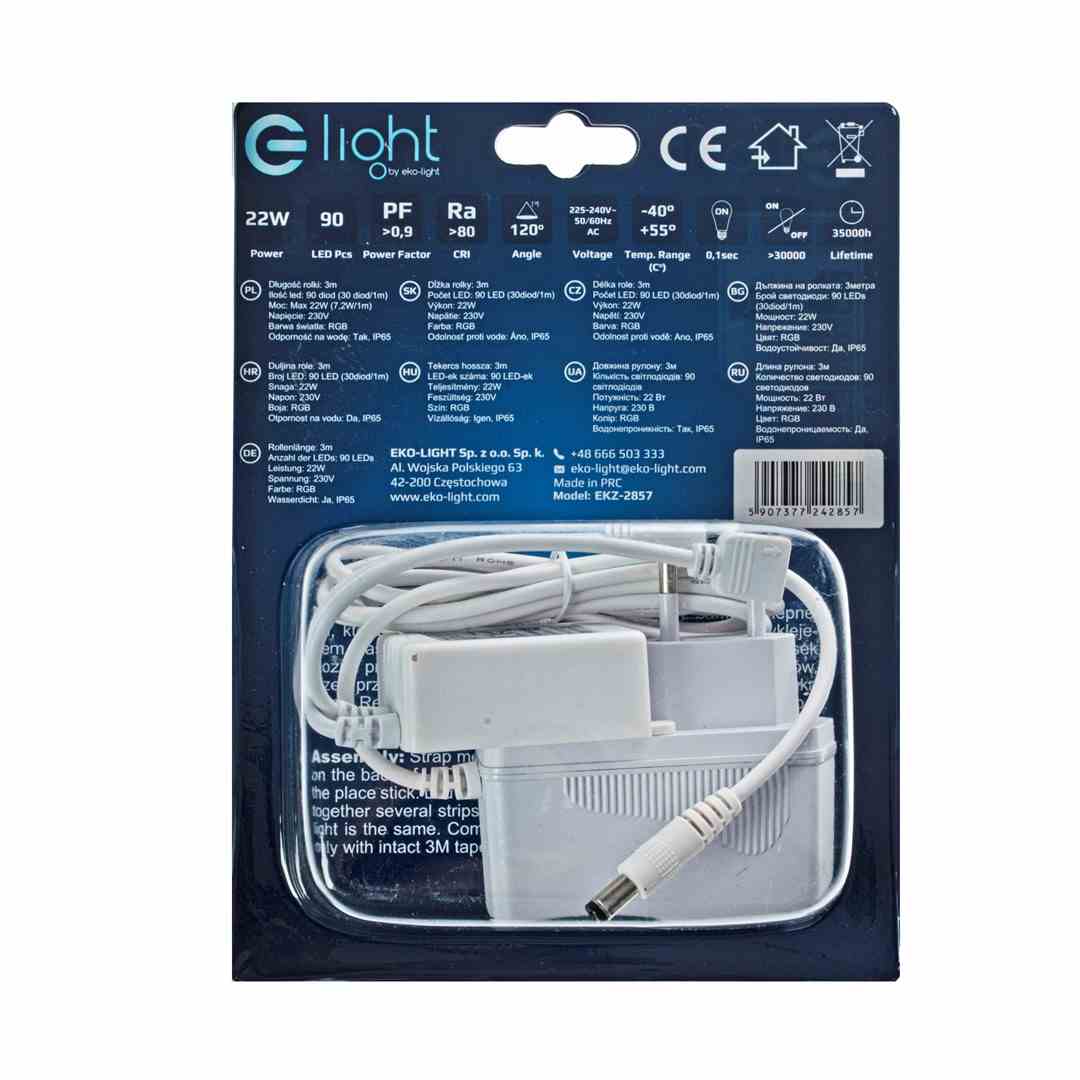 ZESTAW LED RGB 5M marki EKO-LIGHT EKZ2857 to TAŚMA LED 3M RGB , ZASILACZ 12V, STEROWNIK oraz PILOT. Zastosowany sterownik oraz pilot pozwala na zdalną zmianę kolorów i rodzajów świecenia (stałe, migające/zmienne, przechodzące etc.).