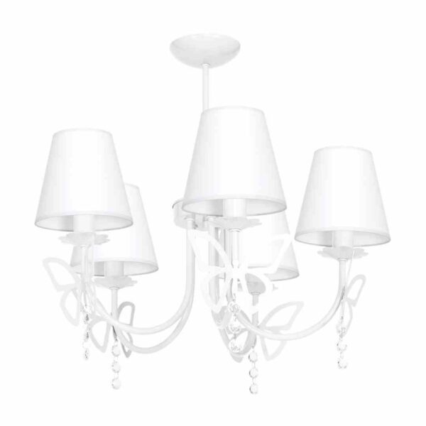 Kolekcja CHARLOTTE WHITE charakteryzuje się motywem latających motyli z abażurem ozdobionym szlachetnymi kryształkami. Lampy doskonale sprawdzą się zarówno w pokojach dziecięcych, jak i salonach oraz sypialniach. W skład kolekcji CHARLOTTE wchodzą: zwisy sufitowe z trzema lub czterema punktami światła oraz kinkiet i lampka biurkowa z jednym źródłem światła. Łącząc w pomieszczeniu kilka lamp z serii, można stworzyć spójną i kompletną aranżację. Cała kolekcja dostępna jest w dwóch wersjach kolorystycznych w białej i w różowej.