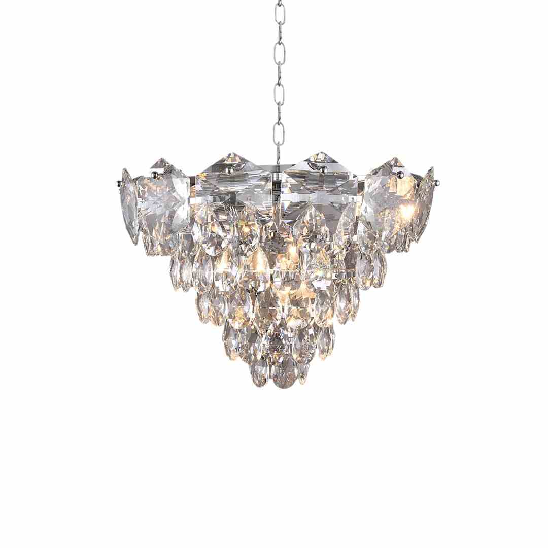 Żyrandol stanowi ciekawy dodatek do wnętrz koło, którego nie sposób przejść obojętnie. Lampa posiada dwa rodzaje kryształów zamontowanych na metalowym szkielecie. Większe kryształy znajdują się w górnej części modelu, natomiast mniejsze w dolnej, co powoduje, że podczas użytkowania padające od niej światło mieni się i pięknie błyszczy. Żyrandol ten nadaje się zarówno do salonu, sypialni, jak i pokoju dziennego utrzymanego w eleganckim i klasycznym stylu. Lampa jest dostępna w chromie.